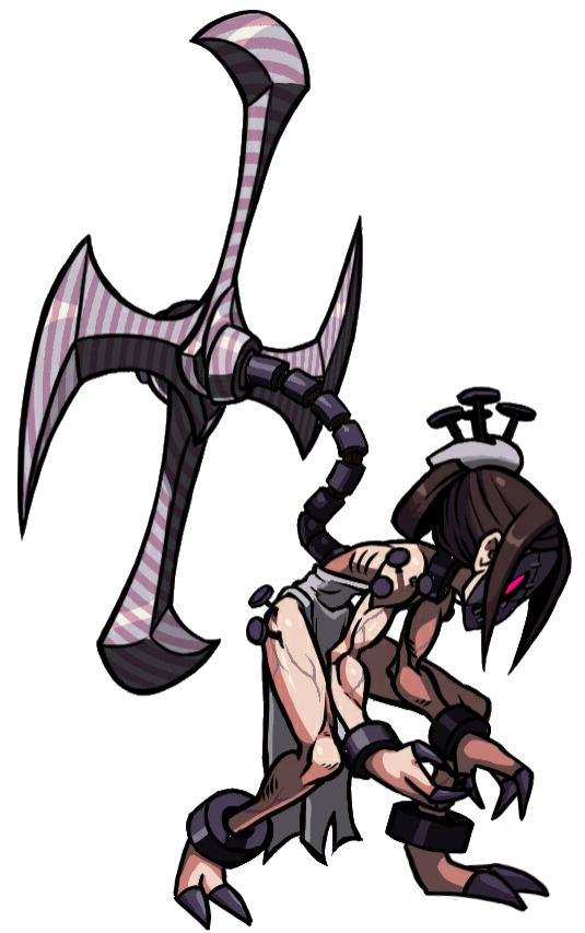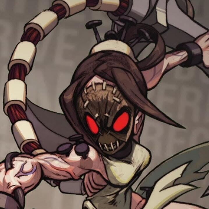 - Almost never wears the mask anymore after being rescued, but preferrs to keep Buer Drive intact for some reason.Partway through her assignment of finding the Skullgirl, Painwheel basically said "screw it I'm going home" and kept rebelling against her orders since then.She found her way home, but despite taking off her mask before knocking on the door, her parents were still horrified anyway and refused to believe she was their daughter. She took the rejection terribly; after just wanting to go home for ages, She wouldn't ever be welcomed back. She lost motivation for everything because of it and resorted to just wandering the outskirts of town alone. Even so, she still continued to fight off Brain Drain's influence for most of that time, mostly because she was too tired to obey even if she were to give in.She was found a week later by Big Band, who was now on his own mission to find the Skullgirl. Maybe he recognized her from lab reports he may have somehow seen. But with the state Painwheel was in, he didn't hesitate to take her in like she was his own kid. Not willing to leave her there alone, he encouraged her to come with him on his mission. Painwheel agreed to go, reluctant at first, and hoped to be able to take her emotions out on people in battle, but he refused to let her fight.He later took her with him back to Lab 8, where she met Peacock and the other kids living there. It took a while to feel okay with being in another lab setting, and Brain Drain still nagging in her head didn't help. But it did help that the people in the lab actually seemed to care for once, especially Big Band and Peacock, who both kept her from totally isolating herself in her grief and anxiety.It took them a long time to coax her out of her shell of anger and distrust, but she eventually began to let go and also began to see Big Band and Peacock as father and sister figures, respectively. Peacock started encouraging Painwheel to participate in her many shenanigans, to which she finally agreed and quickly began to enjoy. She soon started to try to make pranks herself, though these mostly consisted of trying to sneak into and hide in Band Dad's instruments when no one was paying attention.
